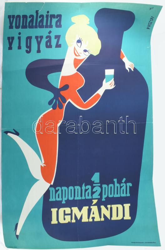 Pusztai Pál (1919-1970): Naponta 1/2 pohár Igmándi, 1960. Plakát, papír, jelzett a plakáton, hajtásnyomokkal, lapszéli kisebb szakadásokkal, feltekerve, 98×67,5 cm