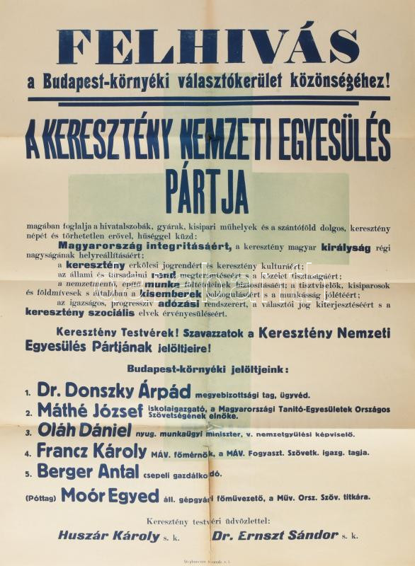 cca 1920-1922 "Felhívás a Budapest-környéki választókerület közönségéhez! A Keresztény Nemzeti Egyesülés Pártja magában foglalja a hivatalszobák, gyárak, kisipari műhelyek, és a szántóföld dolgos, keresztény népét és törhetetlen erővel, hűséggel küzd: