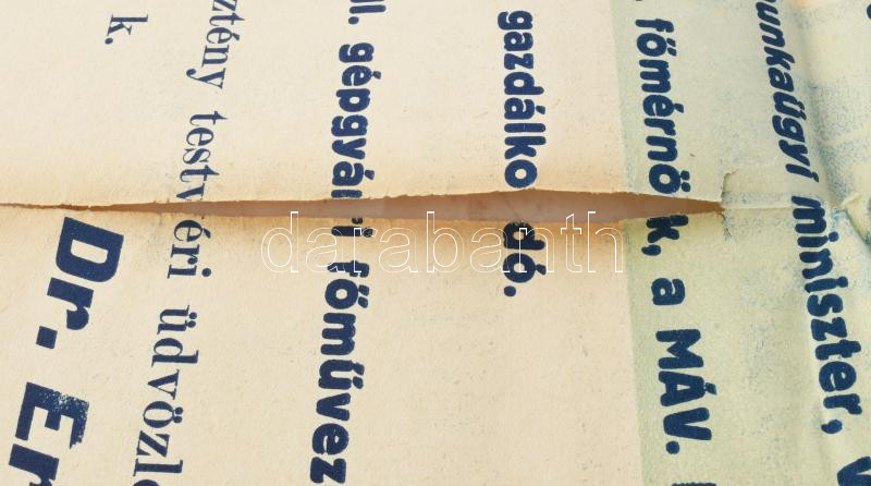 Magyarország integritásáért, a keresztény magyar királyság régi nagyságának helyreállításért; ... Keresztény Testvérek! Szavazzatok a Keresztény Nemzeti Egyesülés Pártjának jelöltjeire! ... Keresztény testvéri üdvözlettel: Huszár Károly s.k. Dr. Ernszt Sándor s. k." Választási plakát, Bp., Stephaneum-ny., szakadt, sérült, 63x48 cm