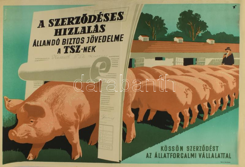 cca 1950-60 Pál György (1906-1986): "A szerződéses hizlalás állandó biztos jövedelme", termelőszövetkezeti plakát, papír, jelzett a plakáton, hajtásnyommal, apró lapszéli szakadásokkal és foltokkal, feltekerve, 50×70 cm