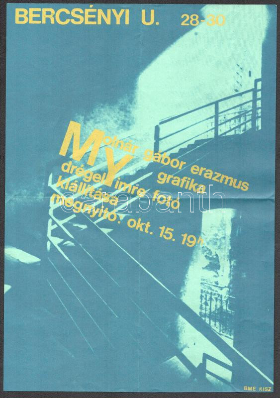 cca 1985-1989 Molnár Gábor erazmus grafika, Drégely Imre fotó kiállítása, Bercsényi u. 28-30, plakát, papír, BME KISZ, hajtva 32x22 cm.
