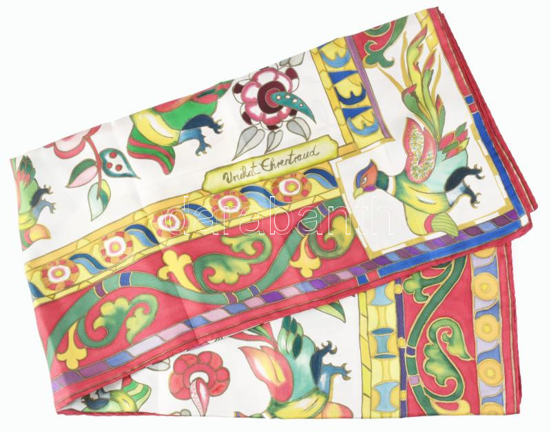 Jelzett virágos-madaras mintás kendő, 90x90 cm