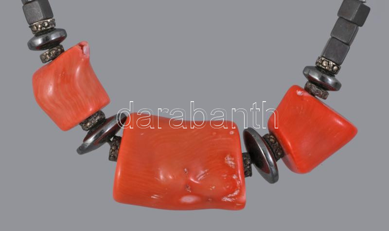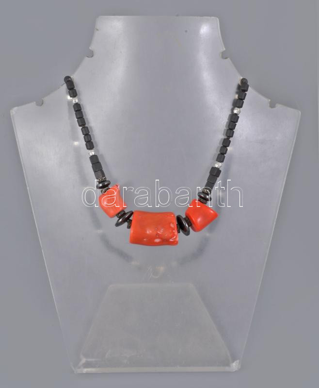 Nyaklánc korall szemekkel, középső szem h: 2,5 cm, lánc h: 52 cm