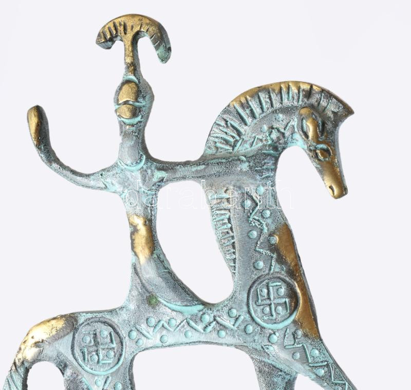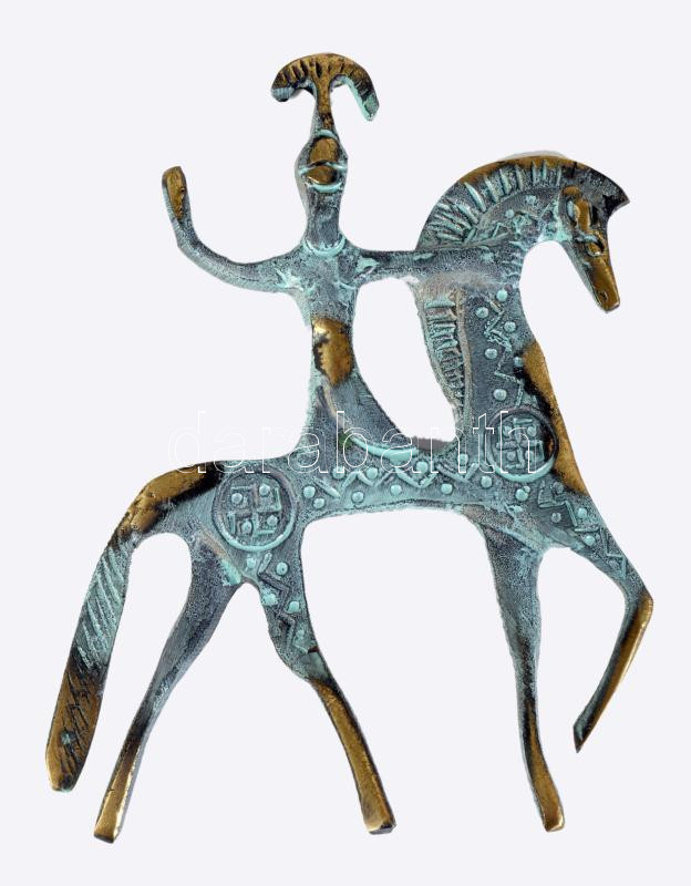 Patinás bronz lovas asztaldísz, m: 13 cm