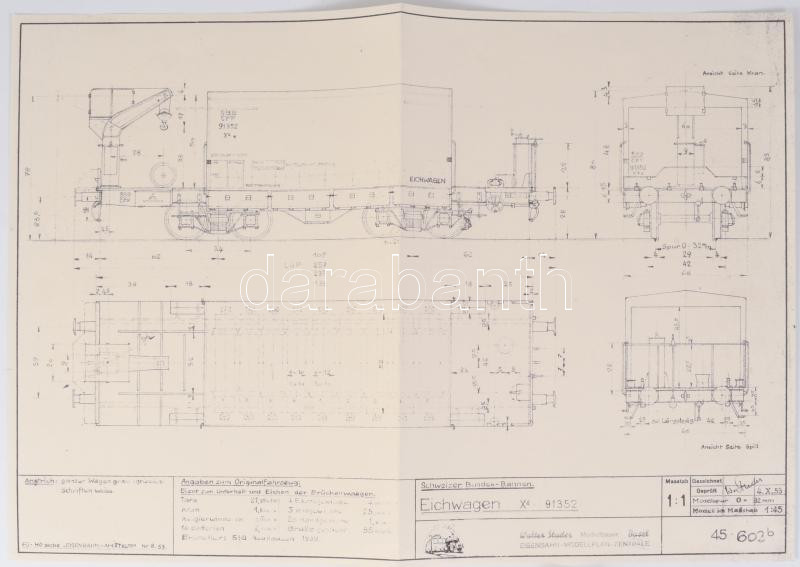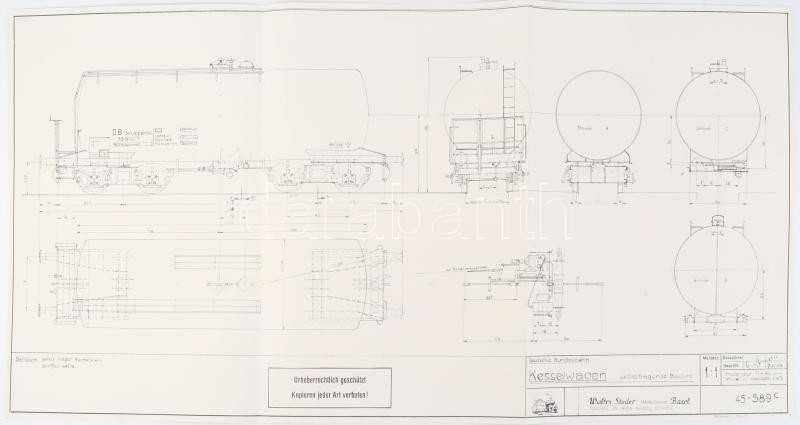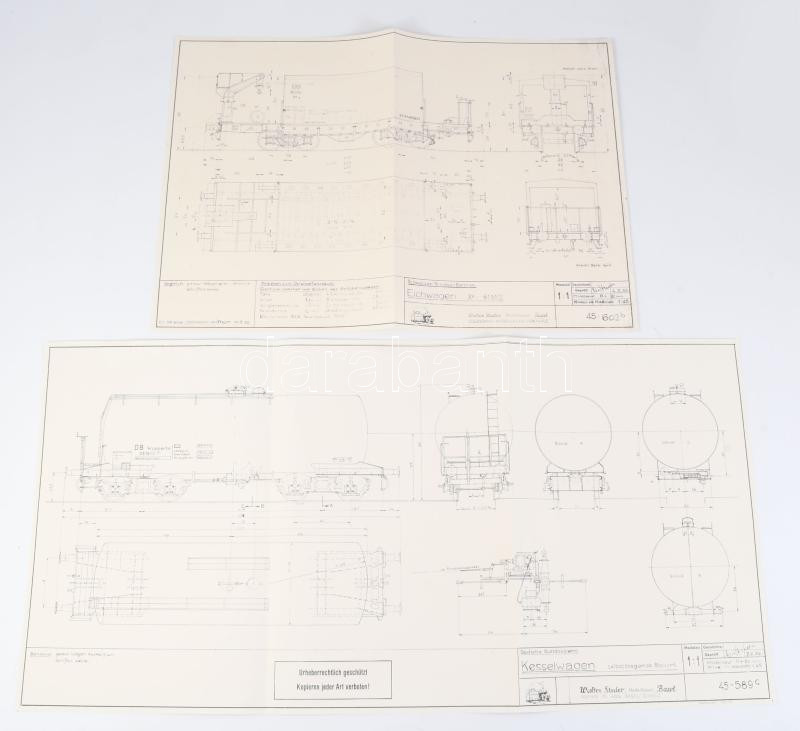 Walter Studer: 2 db modellvasút terv (Schweizer Bundes-Bahnen Eichwagen; Deutsche Bundesbachn Kesselwagen), 1 : 1 méretarány, 29x41,5 cm és 30x59 cm