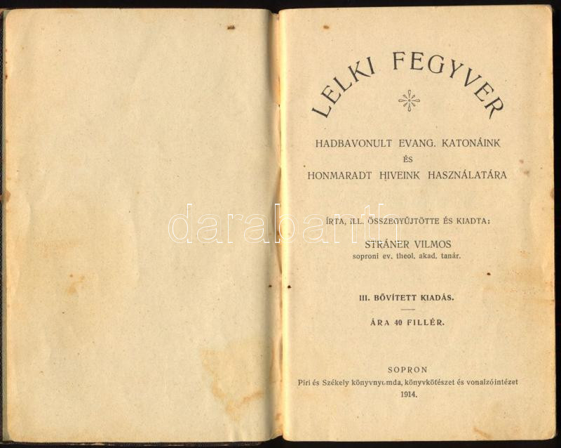 Stráner Vilmos: Lelki fegyver. Hadbavonult evang. katonáink és honmaradt híveink használatára. Sopron, 1914. 59p. Javított gerincű vászonkötés, kopottas állapotban.