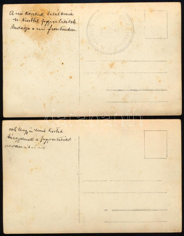 cca 1918 Balkáni front, osztrák-magyar és montenegrói tisztek tárgyalnak a fegyverletételről, 2 db I. világháborús fotólap, a hátoldalon feliratozva, az egyik pecséttel jelzett (M. kir. VII/4. népfölkelő gyalogzászlóalj 3. század), 9x14 cm