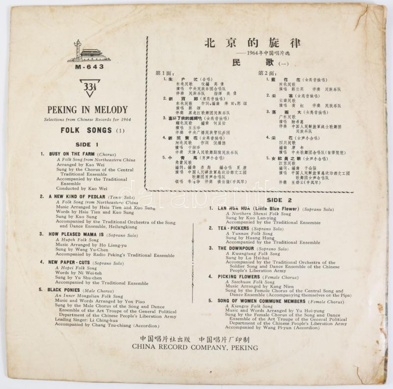 Peking In Melody - Folk Songs 1. Selections From Chinese Records For 1964. (M-643). Vinyl, LP, 10". Kína, 1964. VG+, a tok kissé viseltes
