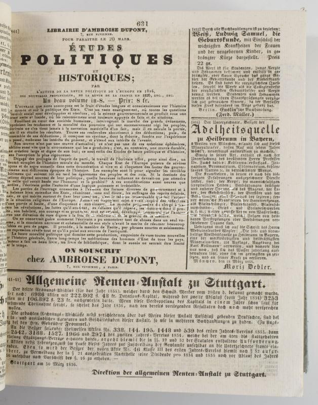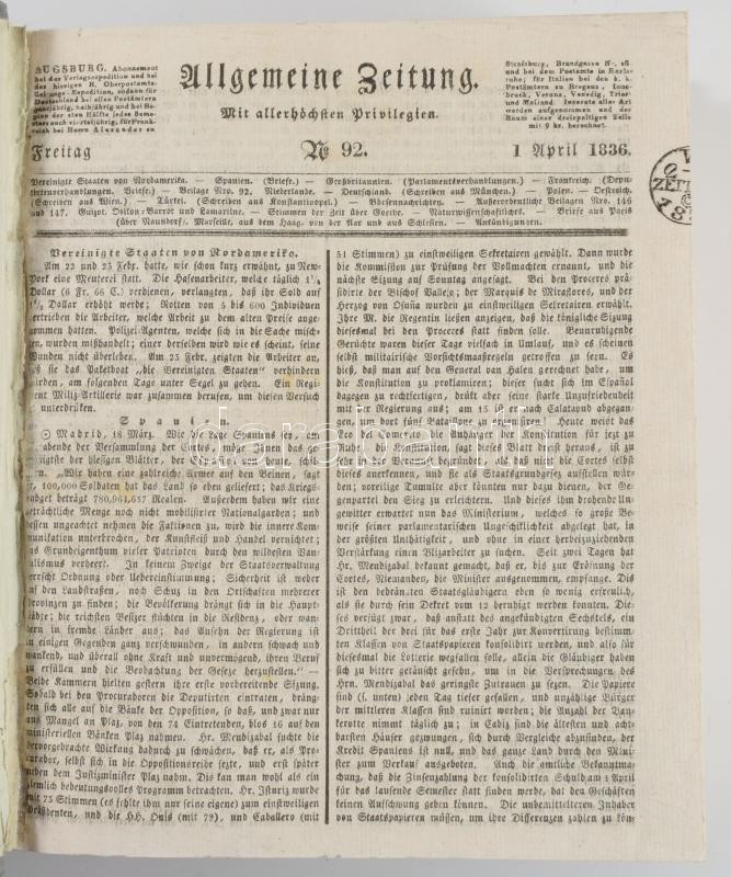 1836 Allgemeine Zeitung c. német nyelvű hírlap 92-186 számai egybe kötve. mind újság szignettával jó állapotban. Korabeli kartonált papírkötésben