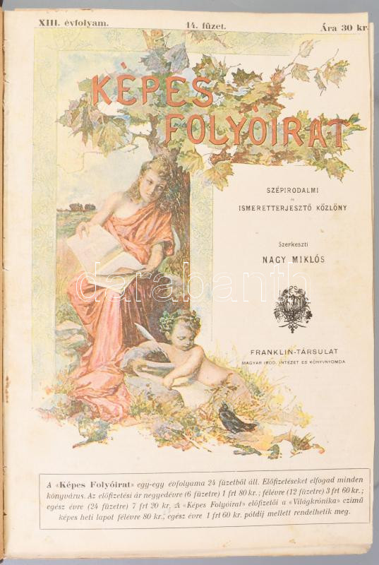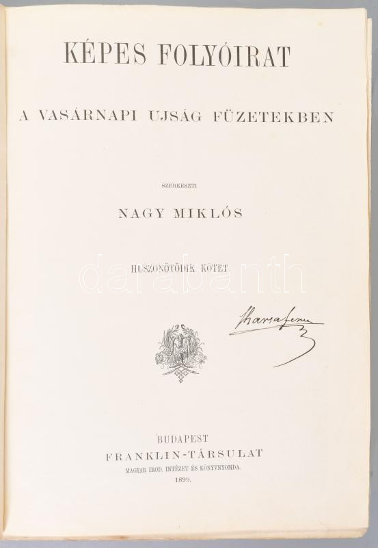 1899 Képes Folyóirat. XXV. kötet. (1899. I. félév.) A Vasárnapi Ujság füzetekben. Szerk.: Nagy Miklós. Bp., 1899, Franklin, VIII+640 p. Kihajtható táblákkal, gazdag képanyaggal illusztrált. Átkötött félvászon-kötés, kopott borítóval.