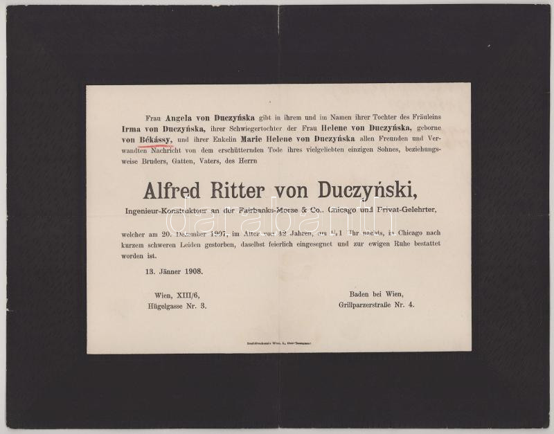 1907 Chicago, Alfred Ritter Von Duczyński (1885-1907) mérnök halotti értesítője, kis lapszéli sérüléssel, 23,5x30 cm