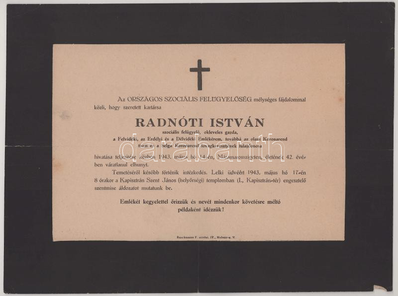 1943 Máramarossziget, Radnóti István (1901-1943) szociális felügyelÅ‘, okleveles gazda, a Felvidéki, az Erdélyi és a Délvidéki Emlékérem tulajdonosa halotti értesÃtÅ‘je, kis lapszéli sérülésekkel, 22x30 cm