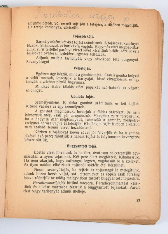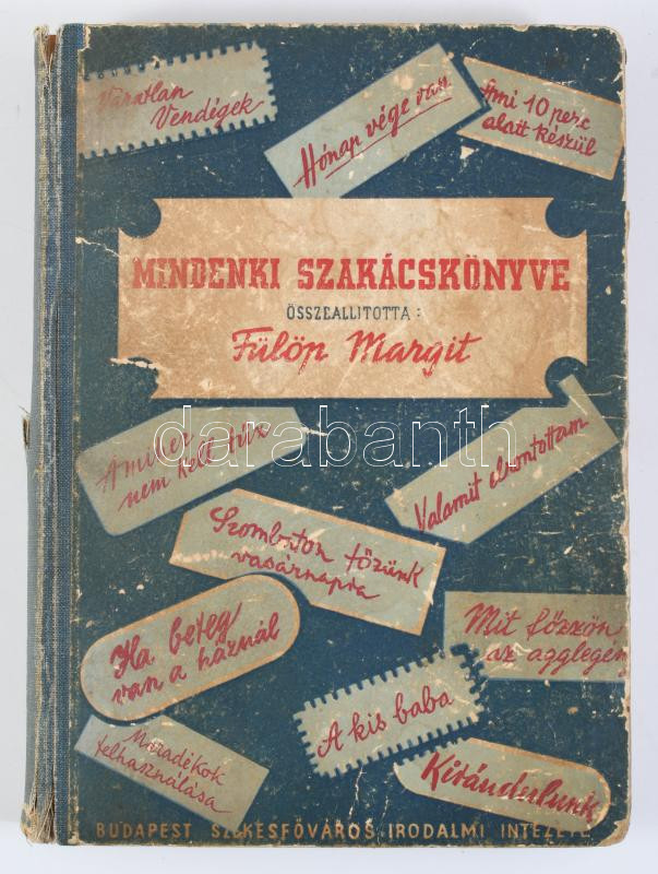 Fülöp Margit: Mindenki szakácskönyve. Bp.,[1949.],Budapest Székesfővárosi Irodalmi és Művészeti Intézet, 207+1 p. 1. kiadás. Benne 3 kézzel írt és egy újságkivágásos recepttel. Kiadói félvászon-kötés, kopott borítóval, sérült gerinccel. laza, sérült kötéssel, foltos lapokkal.
