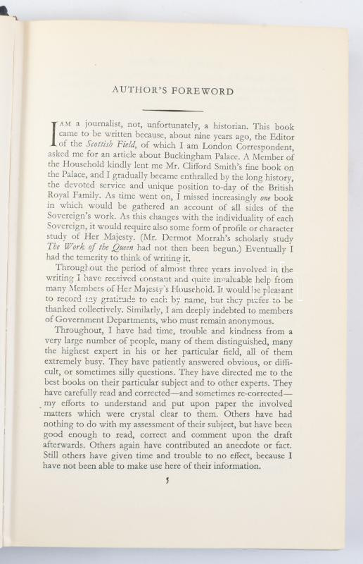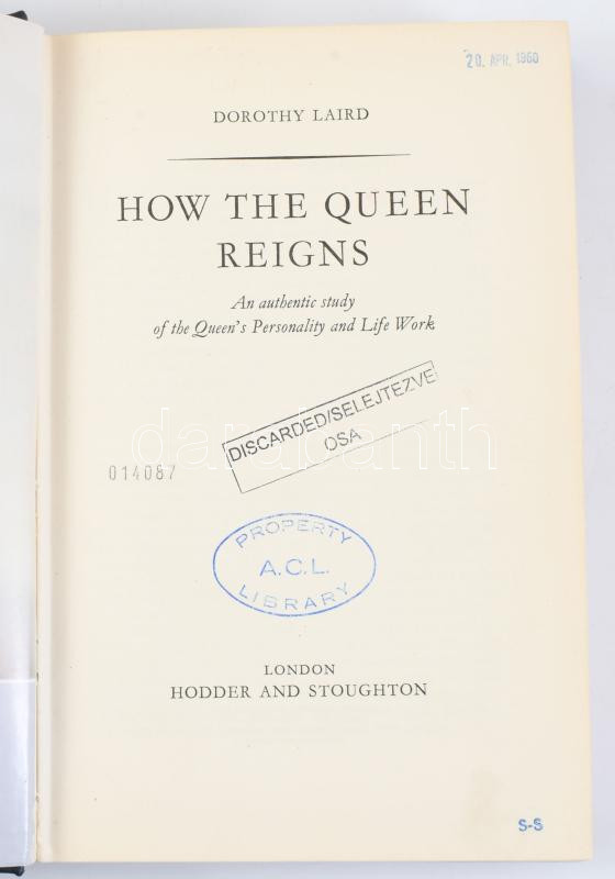 Dorothy Laird: How the Queen Reigns. An authentic study of the Queen's Personality and Life Work. London,1959,Hodder and Stoughton. Gazdag fekete-fehér és egy színes képtáblával illusztrált. Kiadói aranyozott műbőr-kötés, kopott borítóval, sérült gerinccel, volt könyvtári példány.