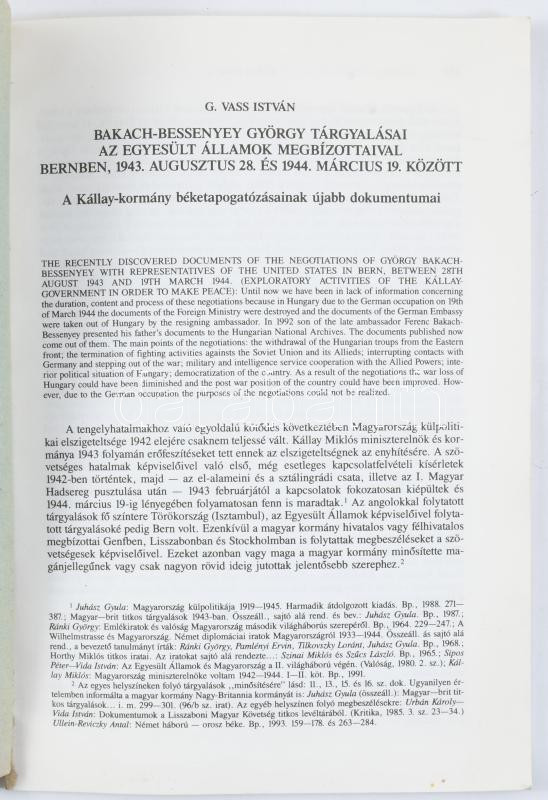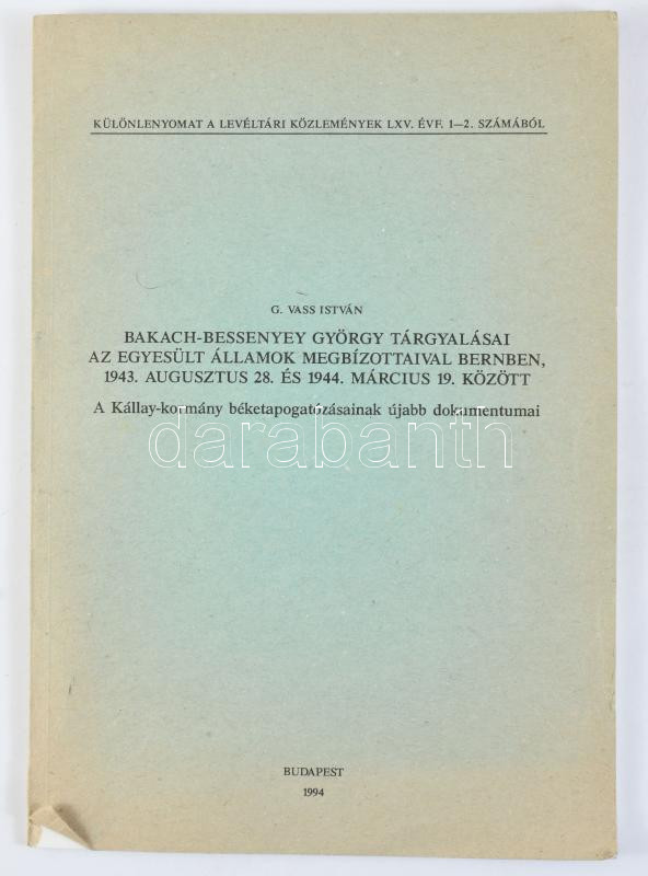 G. Vass István: Bakach-Bessenyey György tárgyalásai Az Egyesült Államok megbízottaival 1943. augusztus 28. és 1944. március 19. között. A Kállay-kormány béketapogatózásainak újabb dokumentumai. Bp., 1994. 153-204p. Papírborítóval.