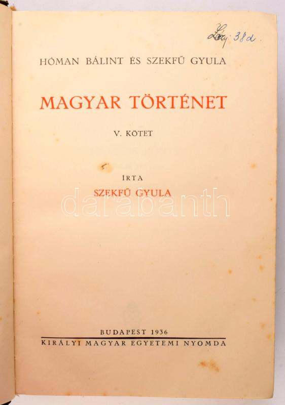 Hóman Bálint - Szekfű Gyula: Magyar történet. I-V. köt. Bp., 1935-1938, Kir. M. Egyetemi Nyomda. Harmadik kiadás. Egészoldalas képekkel, térképekkel illusztrálva. Kiadói félbőr-kötés, változó állapotban, kissé sérült, kopott gerincekkel.