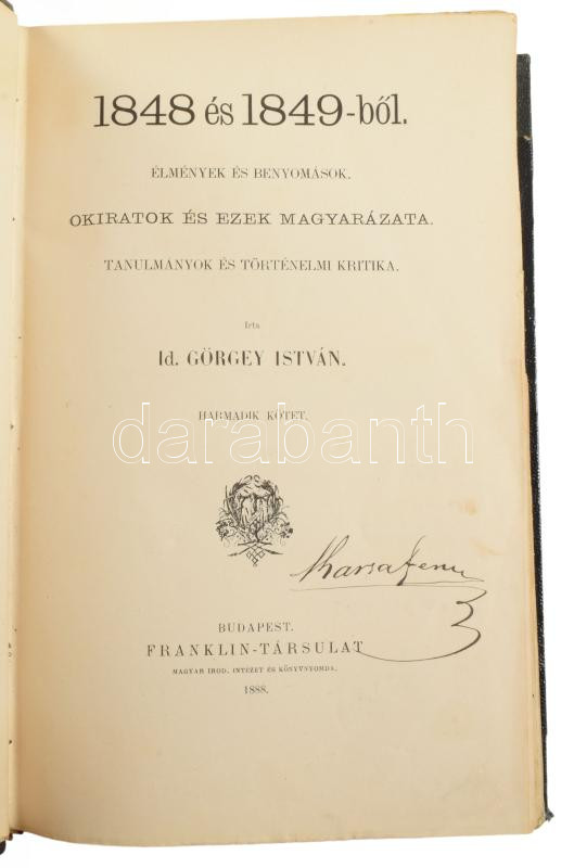 Id. Görgey István: 1848 és 1849-ből. Élmények és benyomások. Okiratok és ezek magyarázata tanulmányok és történelmi kritika. III. köt. Bp., 1888, Franklin, XII+732+1 p. 1. kiadás. A mű 3 kötetben teljes.
