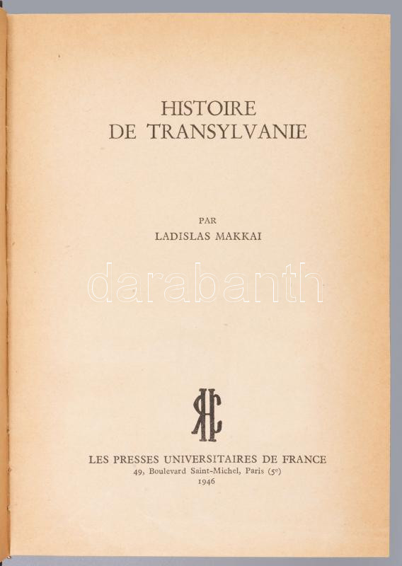 Makkai, Ladislas [László]: Histoire de Transylvanie. Bibliotheque de la Revue d'Histoire Comparée V. Paris, 1946, Le Presses Universitaires de France, 381+1 p.+11 (képtáblák, valamint egy kihajtható genealógiai tábla) t. + 9 (térképek) t. Francia nyelven. Átkötött félvászon-kötés, kissé kopott, kissé foltos borítóval, egy lap sarkán hiánnyal.