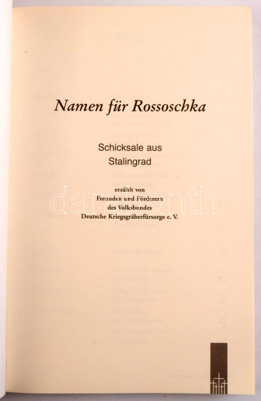 Namen für Rossoschka. Schicksale aus Stalingrad. Erzählt von Freunden und Förderern des Volksbundes Deutsche Kriegsgräberfürsorge e. V. Kassel, 2007, Volksbundes Deutsche Kriegsgräberfürsorge e. V. Német nyelven. Fekete-fehér képanyaggal illusztrált. Kiadói papírkötés.