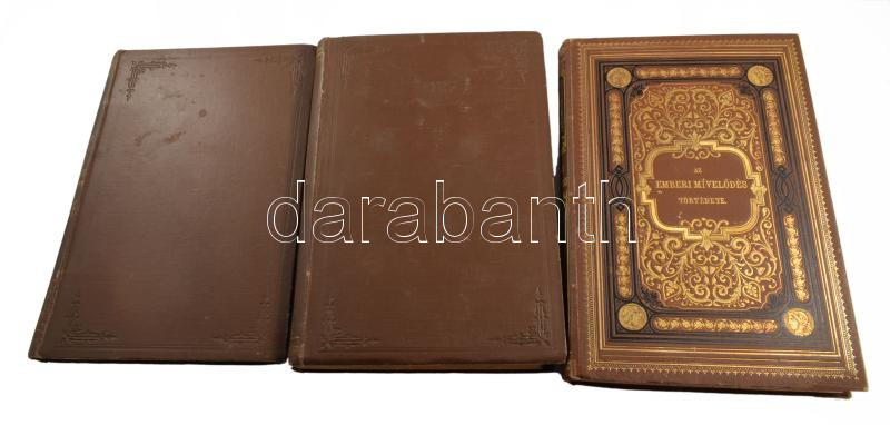 Korabeli aranyozott egészvászon-kötések, a gerinceken és az I. kötet borítóján: "P. Szathmáry Az emberi mívelődés története" és "Az emberi mívelődés története", kopott borítókkal, hiányzótáblákkal, a III. kötetben néhány lapon ceruzás aláhúzásokkal és bejegyzésekkel, két lapon szakadással.