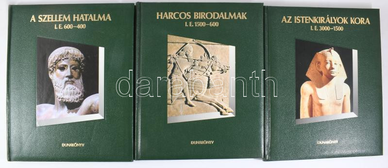 Time-life képes világtörténet sorozat 3 kötete: Istenkirályok kora i. e. 3000-1500.; Harcos birodalmak i. e. 1500-600.; A szellem hatalma i. e. 600-400. Bp., 1993-1994, Dunakönyv. Gazdag képanyaggal illusztrálva. Kiadói egészvászon-kötés.