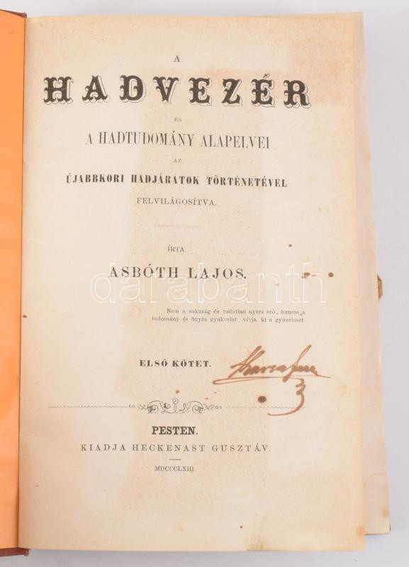 Asbóth Lajos: A hadvezér és a hadtudomány alapelvei az újabbkori hadjáratok történetével felvilágosítva. I. köt. Pest, 1863, Heckenast Gusztáv, 6+320 p.
