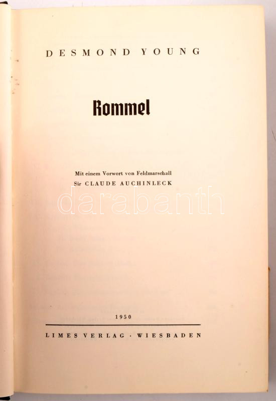 Desmon Young: Rommel. Mit einem Vorwort von Feldmarschall Sir Claude Auchinleck. Wiesbaden, 1950, Limes Verlag. Német nyelven. Fekete-fehér képanyaggal illusztrált. Kiadói egészvászon-kötés, sérült kiadói illusztrált papír védőborítóban.