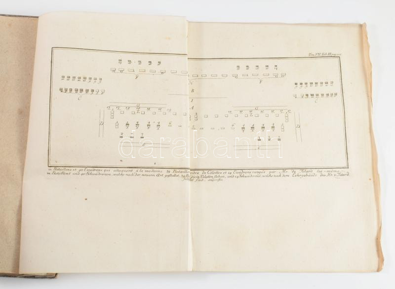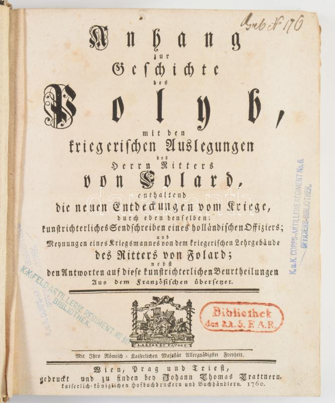 [Hadtudomány] Folard, Jean-Charles Chevalier de,: Anhang zur Geschichte des Polyb, mit den kriegerischen Auslegungen des Ritters Herrn von Folard, Wien - Prag - Triest 1760. Trattern 282 (6)p. + kih rézm. t. Korabeli kartonált kötésben