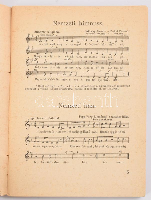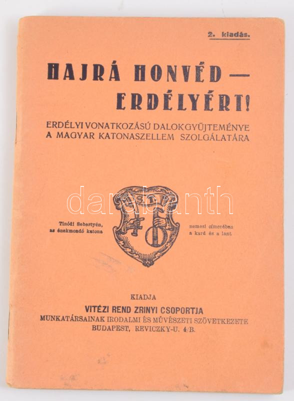 Hajrá honvéd - Erdélyért. Erdélyi vonatkozású dalok gyűjteménye a magyar katonaszellem szolgálatára. Bp., 1940, Vitézi Rend Zrínyi Csoportja, 64 p. 2. kiadás. Kiadói papírkötés.