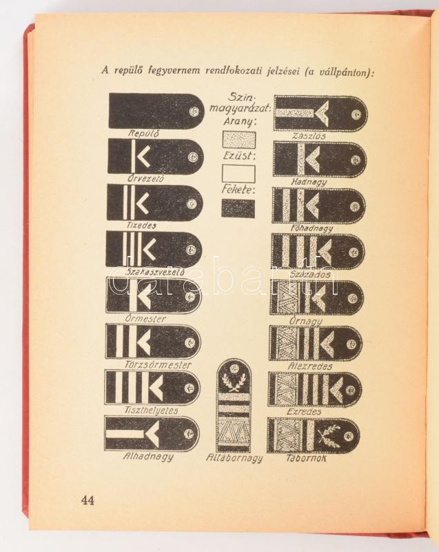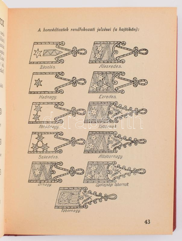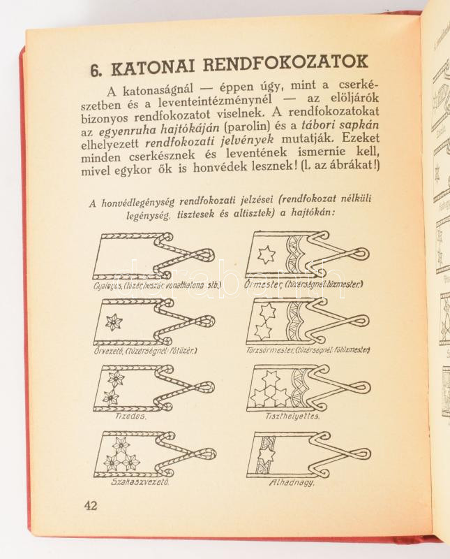 Szurmay Tibor: Honpolgári, honvédelmi ismeretek a magyar ifjúság számára. Cserkészpróbák Könyvei 2. Bp., 1940, Magyar Cserkészszövetség, 150+2 p.+30 t. Gazdag fekete-fehér szövegközti képanyaggal, színes képtáblákkal és köztük egy kihajtható térképpel illusztrált. Benne rangjelzésekkel, uniformisokkal, kitüntetésekkel, címerekkel...stb. Kiadói aranyozott, festett illusztrált vörös egészvászon-kötés, kopott gerinccel, kissé kopott borítóval.