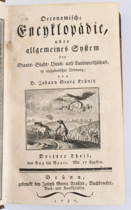 Krünitz, Johann Georg: Oeconomische Encyklopädie, oder allgemeines System der Staats-, Stadt-, Haus- und Landwirthschaft, in alphabetischer Ordnung. Dritter Theil von Aug bis Bauer. mit 17 Kupfern Brünn, 1787. Traßler, 1t (rézm) 815p. 17 kih rézm. t. Aranyozott félbőr kötésben