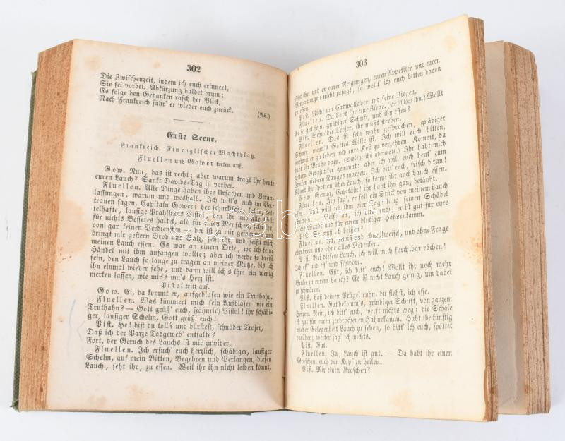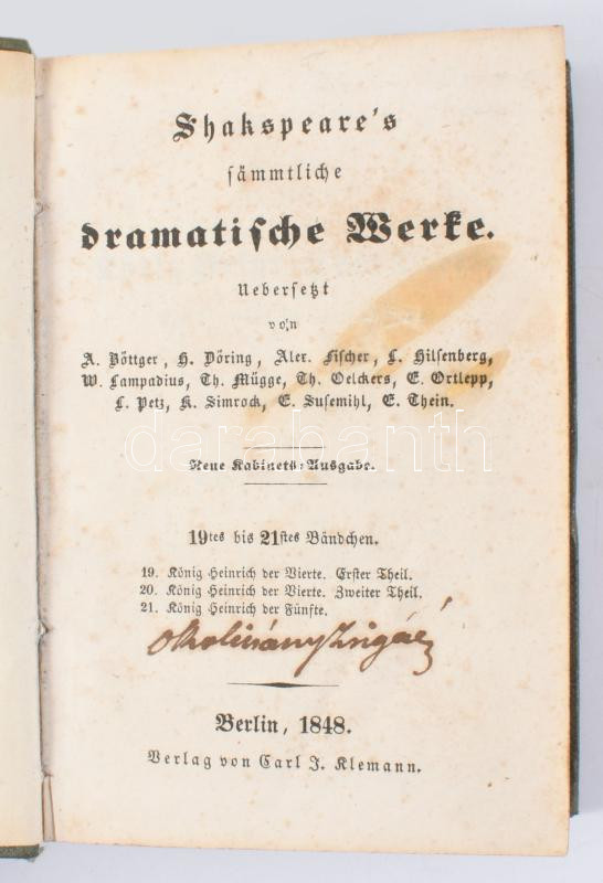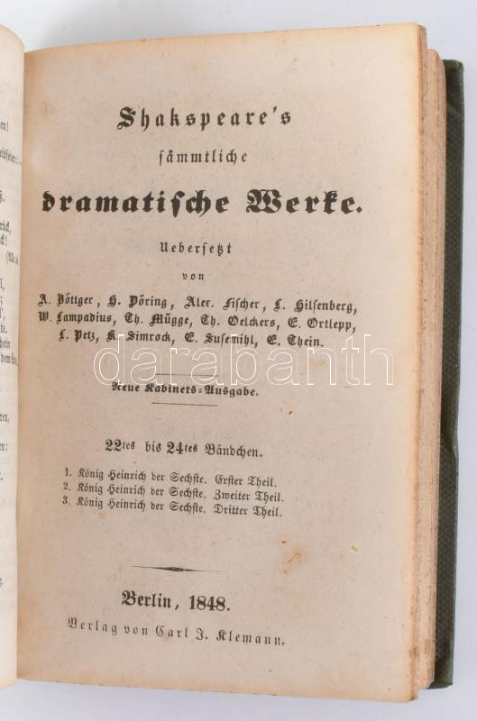 [Shakespeare, William] Shakspeare's sämmtliche dramatische Werke. 19tes bis 21stes, 22tes bis 24 tes Bändchen. [Két kötet egybekötve.] Berlin, 1848, Carl J. Klemann, 316 p.; 296 p. Német nyelven. Egészvászon-kötésben, helyenként kissé foltos lapokkal, tulajdonosi névbejegyzéssel.