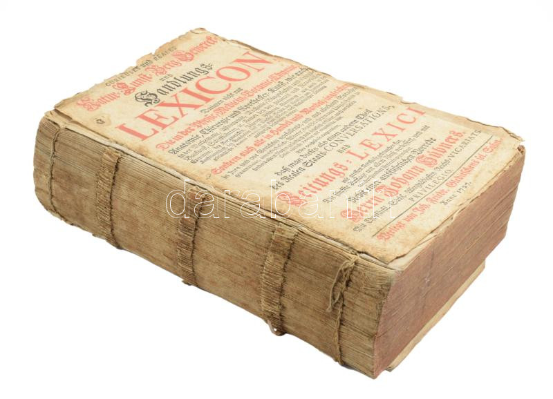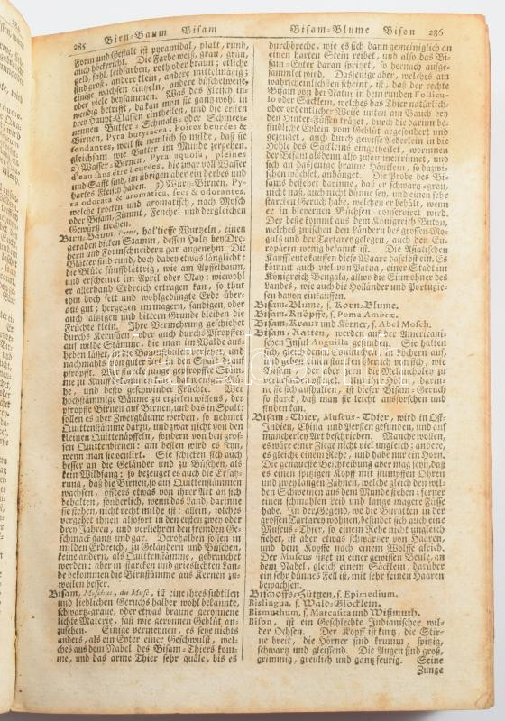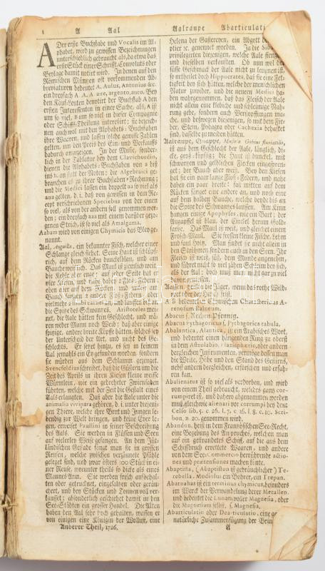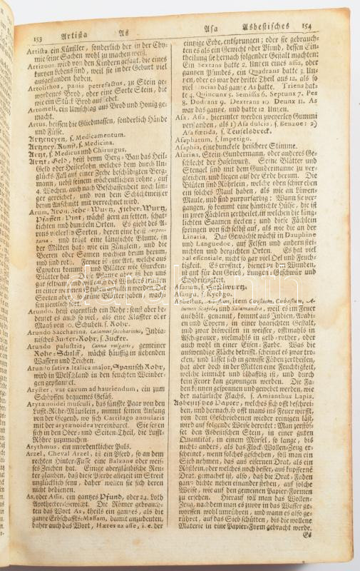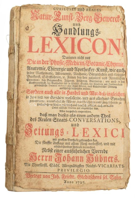 cca 1727 Johann Hübner: Curieuses Natur- Kunst- Gerwerck- und Handlungs-Lexicon. Leipzig, 1727, Joh. Friedr. Gleditsch, hn., én., nyn., 6 sztl. lev.+2144 [kéthasábos számozás] p. Német nyelven. Borító nélkül, hiányzó szennylappal, sérült, levált címlappal, az első 6 levél és a hátsó üres lap levált a könyvtestről, foltos lapokkal, néhány lapon szélén kis sérüléssel.