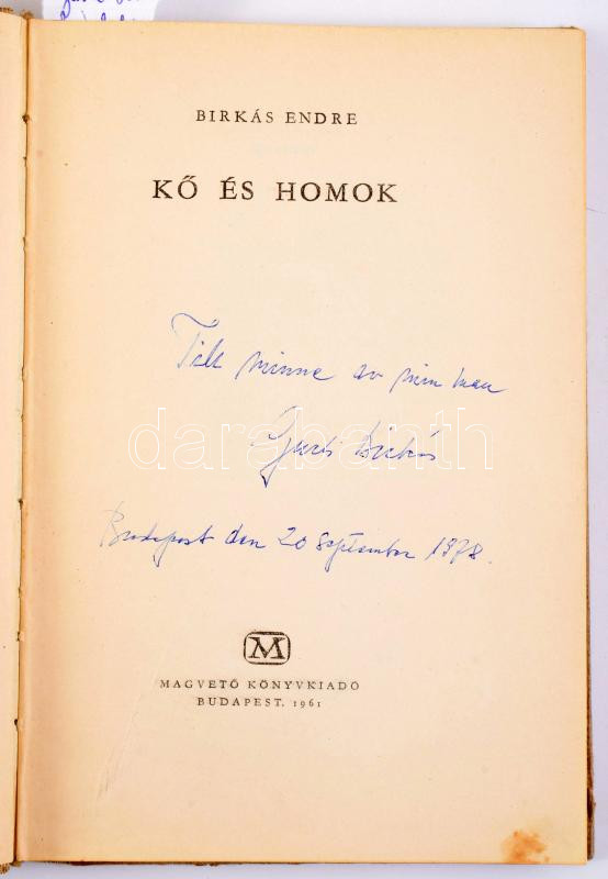 Birkás Endre: Kő és homok. Bp., 1961, Magvető. 233p. Gurli Birkás, Birkás Endre felesége, Raoul Wallenberg munkatársa által dedikált példány. Svéd nyelvű sorokkal. Félvászon kötés, belül a gerincnél kissé szétvált.