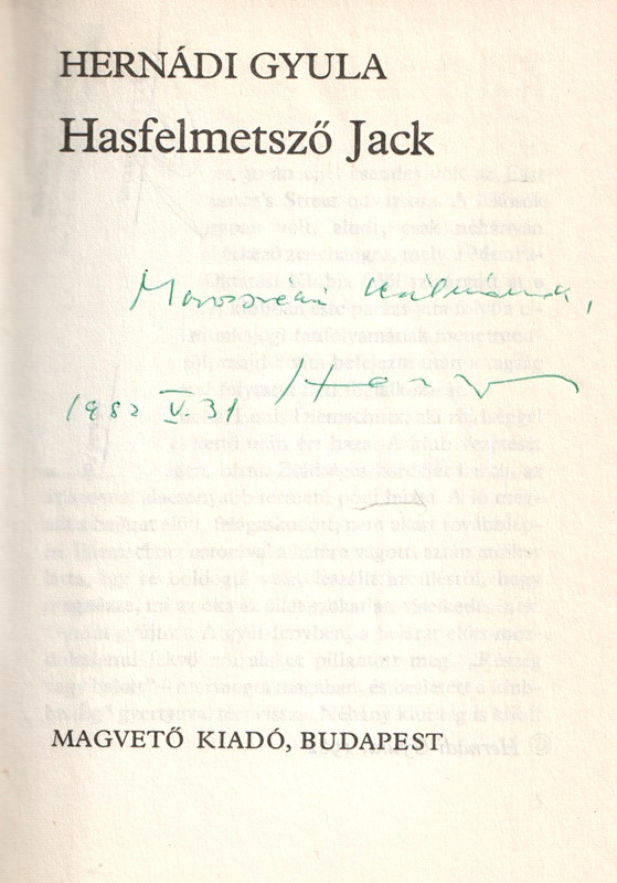 Dedikált: "Marosszéki Kálmánnak Hernádi Gyula. 1982. V. 31."