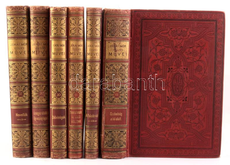 Jókai Mór összes művei. Nemzeti kiadás. 6 kötet. (XX., XXXVI., XXXVII., LXVI., LXXXVI., XCI.) Bp., 1910-1913, Révai. Kiadói aranyozott gerincű egészvászon sorozatkötés, változó állapotban.