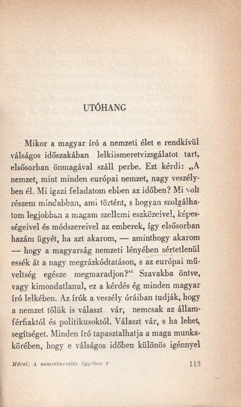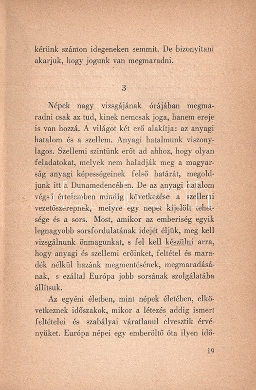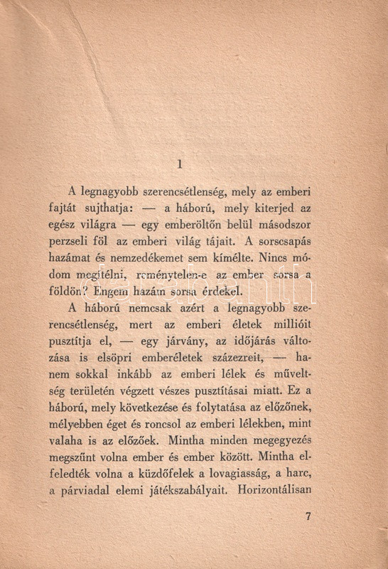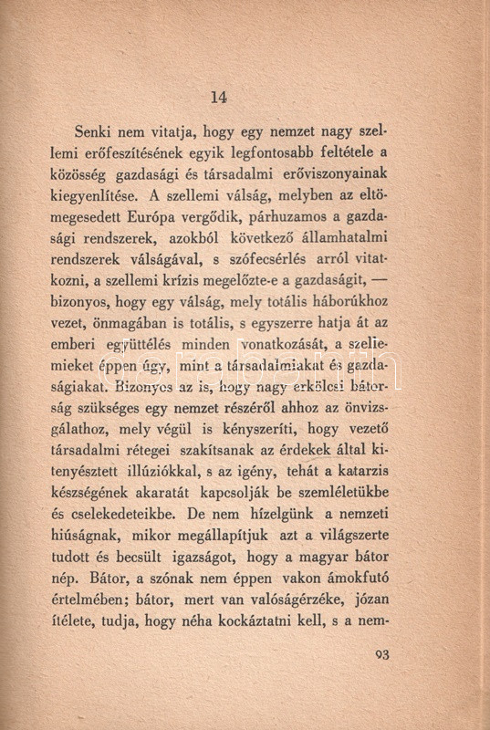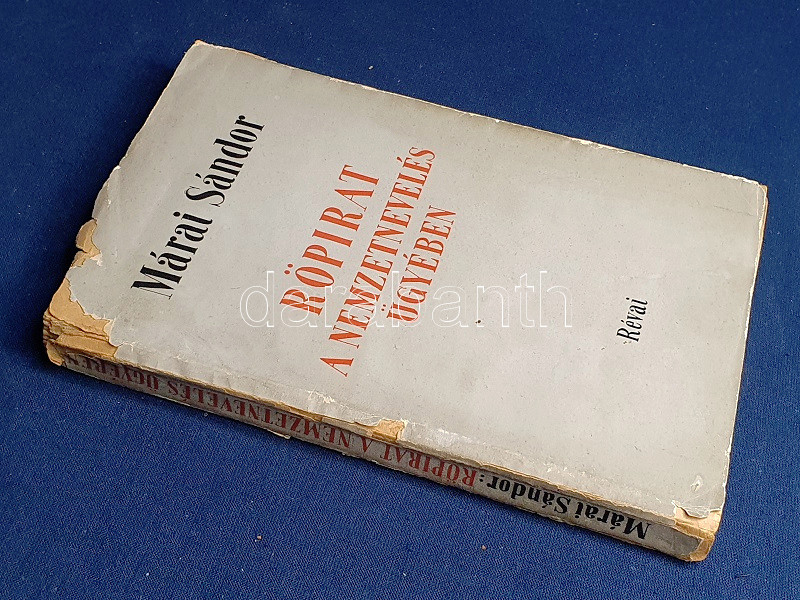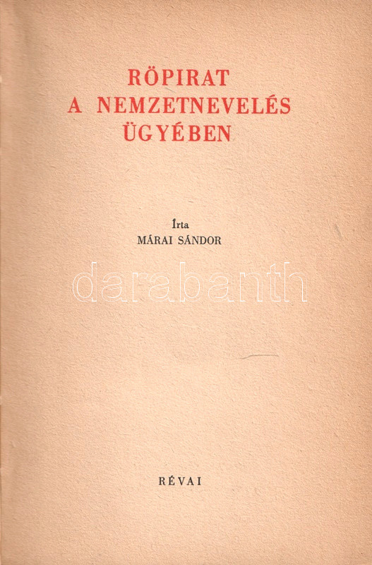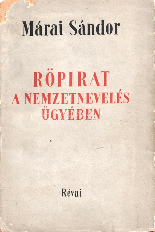 Márai Sándor helyzetértékelÅ‘ Ãrása, mely a háború árnyékába került magyarság túlélési stratégiáit elemzi, elÅ‘ször 1942-ben jelent meg, példányunk az Ãrás elsÅ‘ bÅ‘vÃtett kiadásából való.