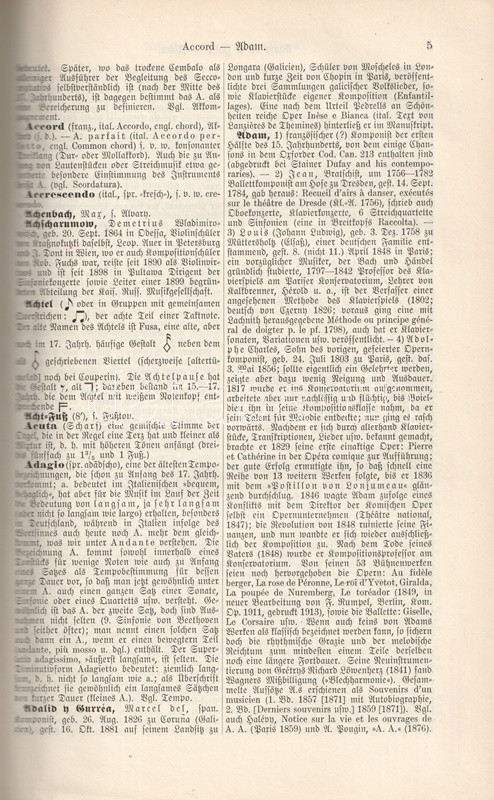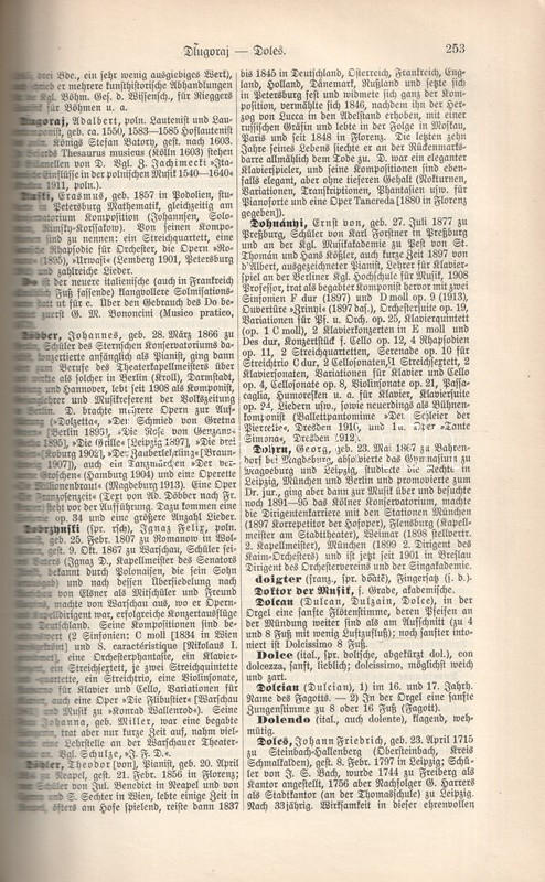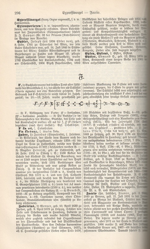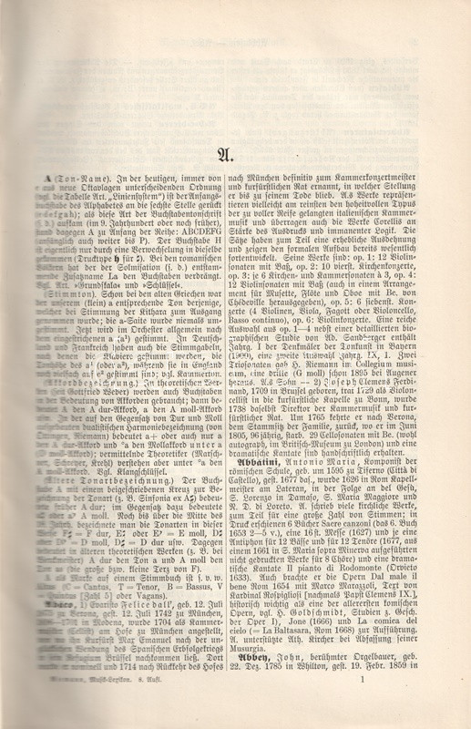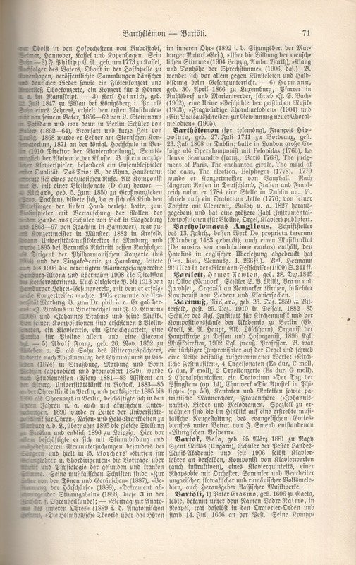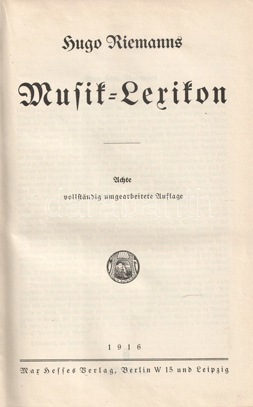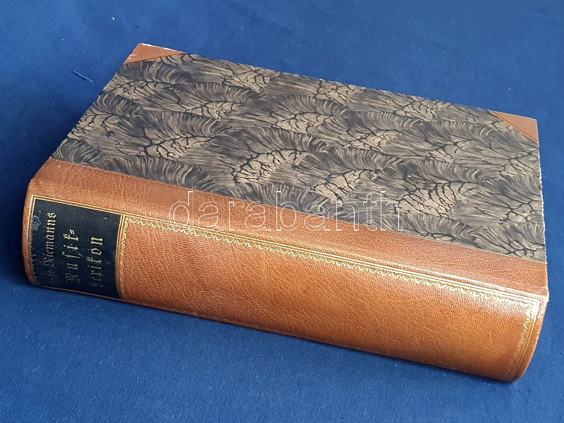 Hugo Riemann (1849-1919) német zenetörténész, zeneszerző és zenepedagógus, korának vezető zenei elméletírója. Összefoglaló, hatalmas zenei lexikonja először 1882-ben jelent meg. Példányunk a nyolcadik, átdolgozott kiadásból való. Két hasábra tördelt szövegoldalain a szócikkek között a zeneelméleti ábrák, zenetörténeti részletek és zeneszerzői életrajzok között feltűnik Bartók Béla és Dohnányi Ernő rövid szócikke is.