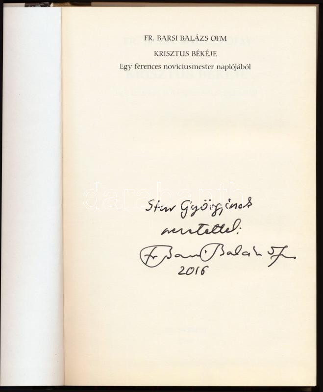 Barsi Balázs: Krisztus békéje. Egy ferences novíciusmester naplójából. A szerző, Barsi Balázs (1946-) Széchenyi-díjas ferences szerzetes, hitszónok, teológiai tanár által dedikált példány! Kecskemét, 2010, magánkiadás, 319+[1] p. Kiadói kartonált papírkötés.