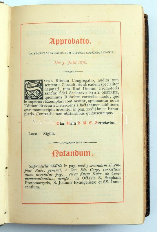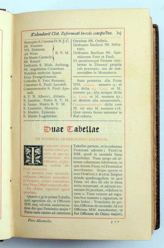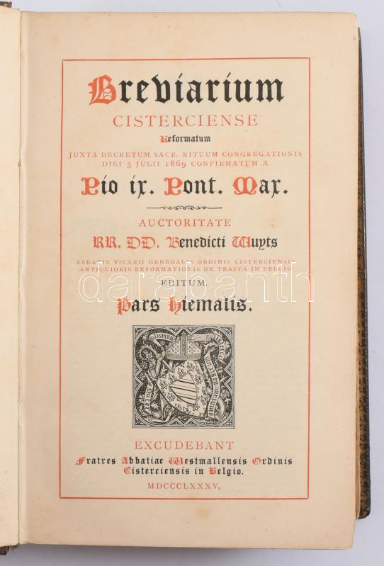 Breviarium Cisterciense Reformatum. Juxta Decretum Sacr. Rituum Congregationis Diei 3 Julii 1869 [...] Antiquioris Reformationis De Trappa In Belgio Editum. Pars Hiemalis. [Malle], 1885, Fratres Abbatiae Westmallensis Ordinis Cisterciensis in Belgio, LXVII+[1]+625+[1]+234+[10]+20 p. Latin nyelven. Aranyozott egészbőr-kötésben, nagyrészt jó állapotban, a borítón és gerincen némi kopással, helyenként minimálisan foltos lapokkal. Ritka!