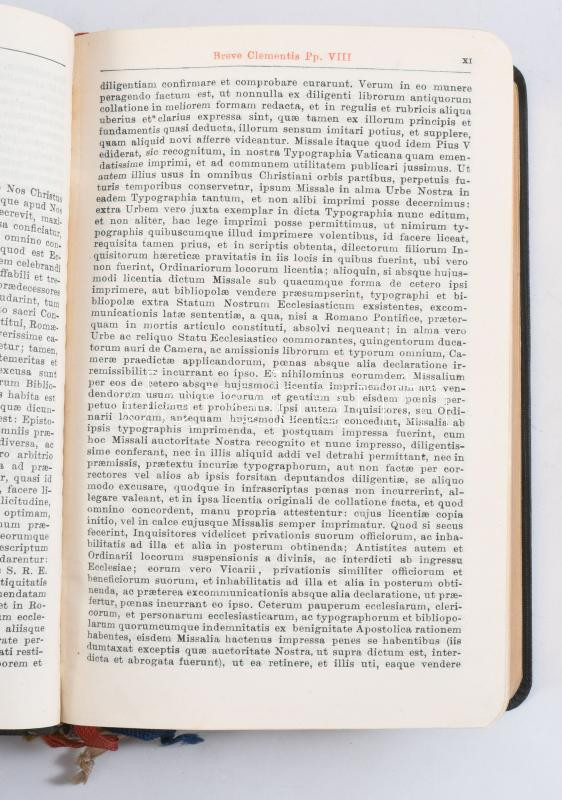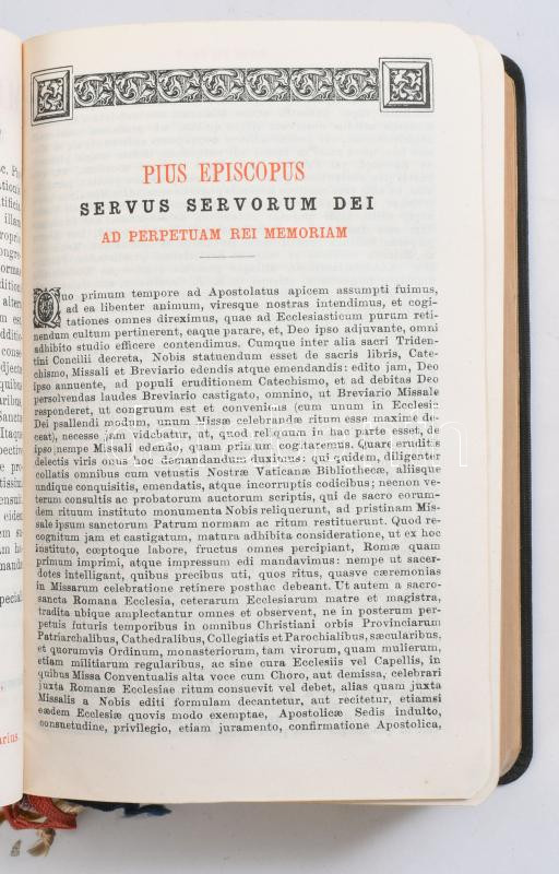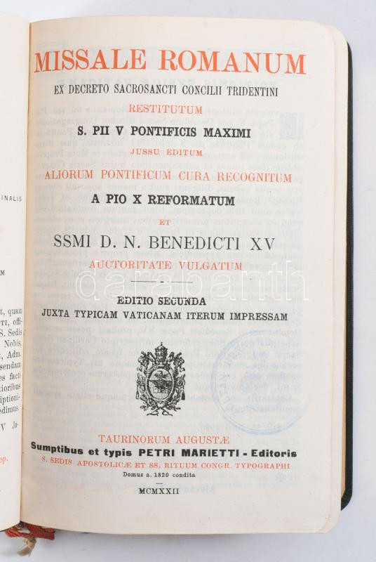 Missale Romanum ex decreto sacrosancti Concilii Tridentini restitutum S. Pii V. Pontificis Maximi jussu editum aliorum pontificum cura recognitum a Pio X reformatum et SSMI D. N. Benedicti XV auctoritate vulgatum. Taurinorum Augustae [Torino], 1922, Petri Marietti. Latin nyelven. Félbőr-kötésben, aranyozott lapélekkel, nagyrészt jó állapotban.