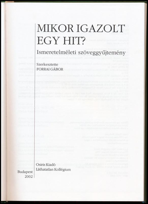 Forrai Gábor (szerk.): Mikor igazolt egy hit? Ismeretelméleti szöveggyűjtemény. Szemeszter. Bp., 2002, Osiris - Láthatatlan Kollégium, 172 p. Kiadói kartonált papírkötés.