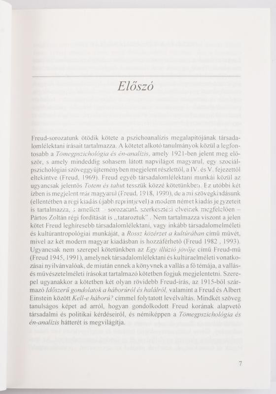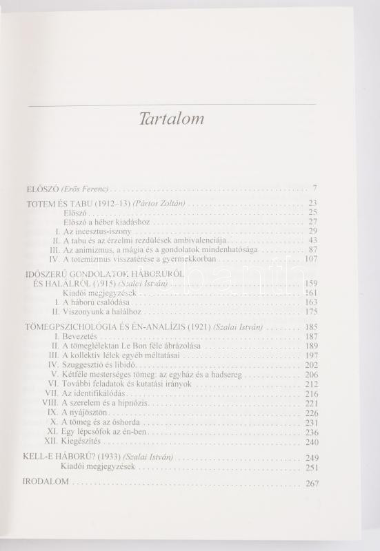 Sigmund Freud: Tömegpszichológia. Társadalomlélektani írások. Ford.: Pártos Zoltán, Szalai István. Sigmund Freud művei V. 1995, Cserépfalvi, 275+1 p. Kiadói papírkötés.