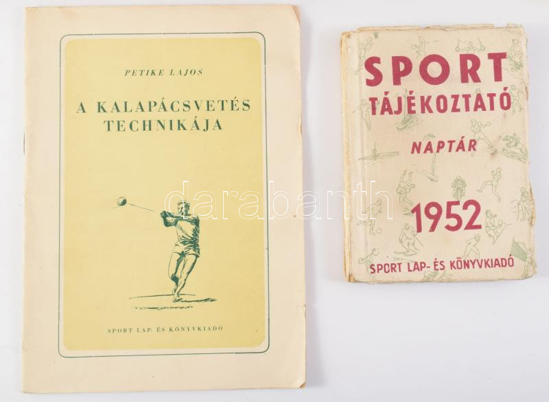 4 db sport témájú könyv és kiadvány: Feleki László: Tizenhat nap. Bp., 1953, Szépirodalmi Könyvkiadó. Kiadói félvászon-kötés. Megjelent 5000 példányban. + Atlétikai versenyek rendezése. Módszertani útmutató. Bp., 1955, Sport. Kiadói tűzött papírkötés. Megjelent 1100 példányban. + Petike Lajos: A kalapácsvetés technikája. Bp., 1952, Sport. Kiadói tűzött papírkötés. + Sport tájékoztató naptár 1952. Kiadói papírkötés, viseltes, hiányzó hátsó borítóval.