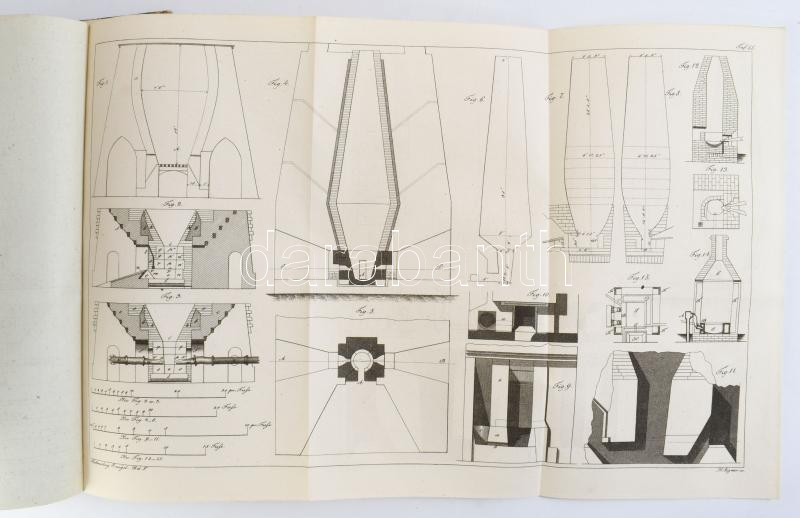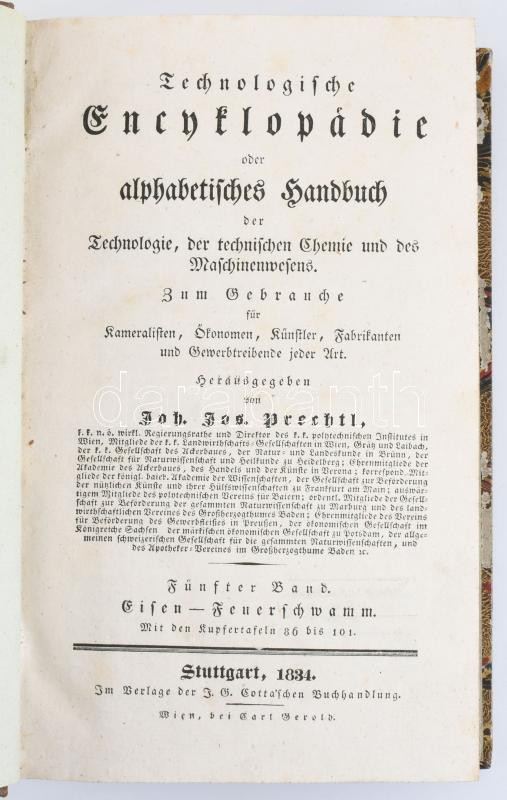 Prechtl, Joh.Jos.: Prechtl: Technologische Encyklopädie oder alphabetisches Handbuch der Technologie, der technischen Chemie und des Maschinenwesens, Zum Gebrauche für Kameralisten, Ökonomen, Künstler, Fabrikanten und Gewerbetreibende jeder Art, Bd. 5 Eisen bis Feuerschwamm. Stuttgart, J.G. Cotta'schen Buchhandlung, 1834. 634 p. Kihajtható rézmetszetű tábla mellékletekkel. Aranyozott félbőr kötésben.