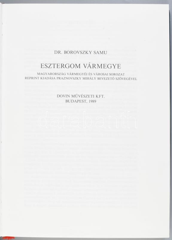 Borovszky Samu: Esztergom vármegye. Magyarország vármegyéi és városai. Praznovszky Mihály bevezetőjével. Bp., 1989, Dovin Művészeti Kft. Reprint kiadás. Kiadói egészvászon-kötés, kiadói papír védőborítóban.