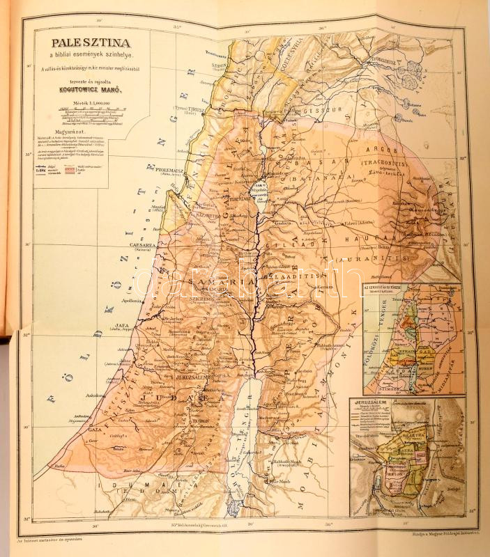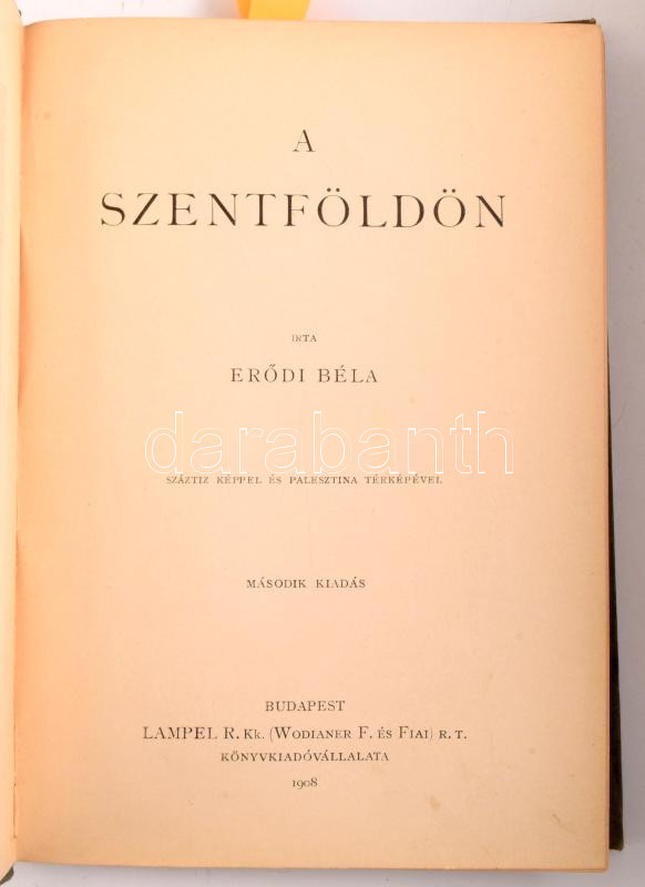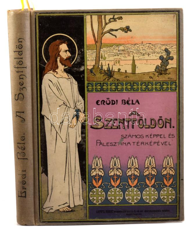 Erdődi Béla: A szentföldön. Bp.,1908., Lampel R. (Wodianer F. és Fiai) Rt., VIII+264 p.+1 (kihajtható térkép) t. Második kiadás. Szövegközti és egészoldalas képekkel illusztrált. A borító illusztrációja Tull Ödön (1870-1911) munkája. Kiadói festett, aranyozott egészvászon-kötés, Gottermayer-kötés, márványozott lapélekkel, kopott borítóval.