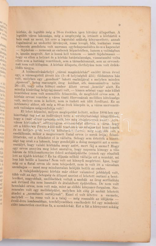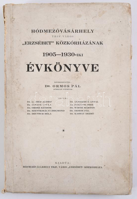 Hódmezővásárhely thjf. város ,,Erzsébet" Közkórházának 1905-1930-iki évkönyve. Szerk.: Ormos Pál. Hódmezővásárhely, [1932], ,,Erzsébet" Közkórház (Bp., Révai-ny.), 382 p.+ 31 (fekete-fehér képek) t. Kiadói papírkötés, kissé sérült, koszos borítóval, helyenként kissé foltos lapokkal, részben felvágatlan.