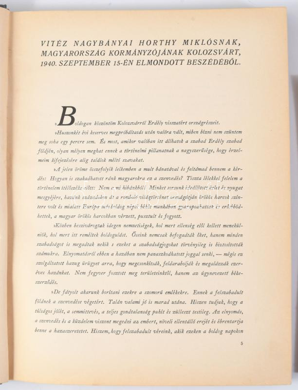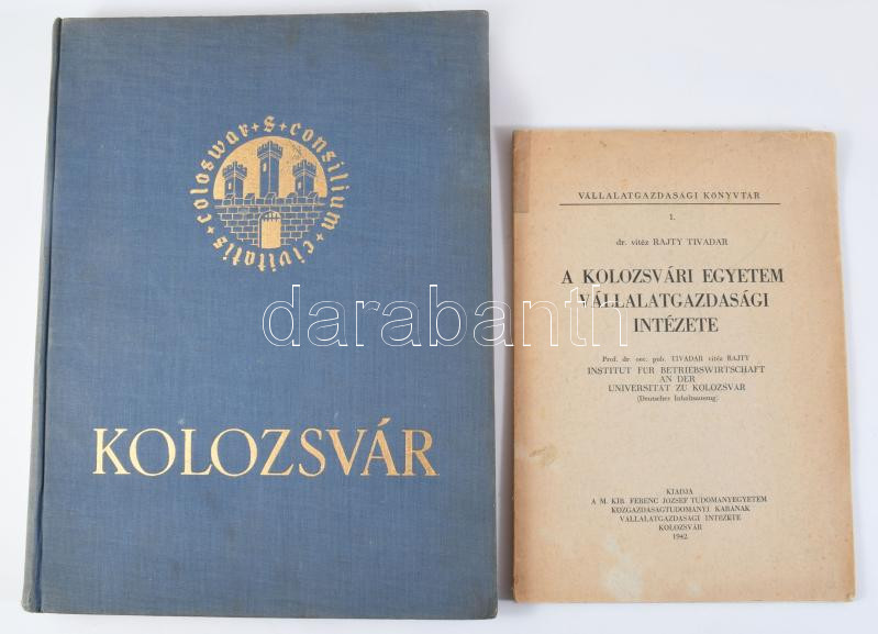 Az Erdély visszatérésének alkalmából kiadott tematikus városmonográfia Kolozsvár évszázadainak történetét követi nyomon, a román időszakot is beleértve, ezen kívül méltatja Kolozsvár szellemi, tudományos, művészeti és építészeti potenciálját. A kötet elején Horthy Miklós ünnepi beszéde, végén Tamási Áron rövid ünnepi publicisztikája. A 99. oldaltól fotómelléklet. A kötet 1944-ben német nyelven is megjelent. Kiadói aranyozott, illusztrált kiadói egészvászon-kötésben, kopott borítóval, a gerincen apró sérüléssel. + Rajty Tivadar: A kolozsvári egyetem vállalatgazdasági intézete. Vállalatgazdasági Könyvtár 1. Kolozsvár, 1942, M. Kir. Ferenc József Tudományegyetem Közgazdaságtudományi Karának Vállalatgazdasági Intézete, 43+1 p. Kiadói papírkötés, a borítón kis sérüléssel.