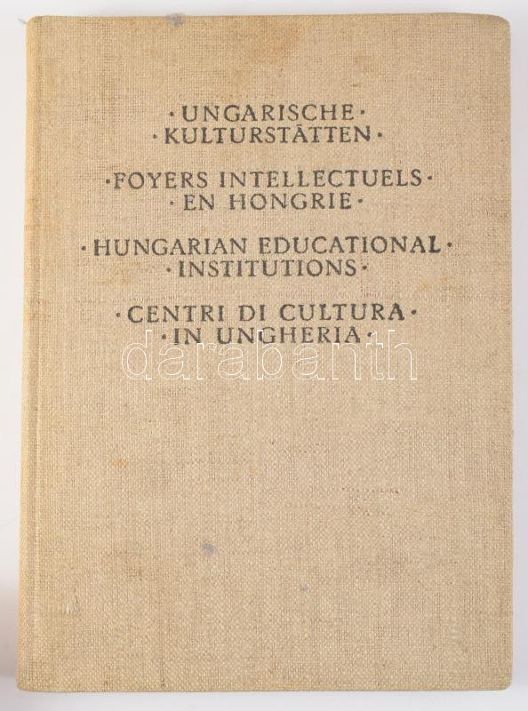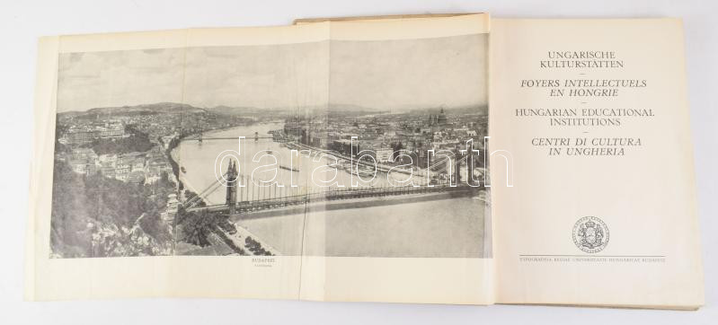 Ungarische Kulturstätten - Foyers intellectuels en hongrie - Hungarian educational institutions - Centri di cultura in Ungheria. Bp., én., M. Kir. Egyetemi-ny., 192 p. Fekete-fehér képanyaggal illusztrált. Négy nyelven. Kiadói egészvászon-kötés, foltos borítóval, a kihajtható panoráma-képen hajtásnyomokkal.
